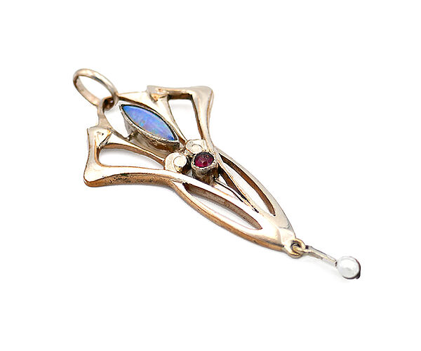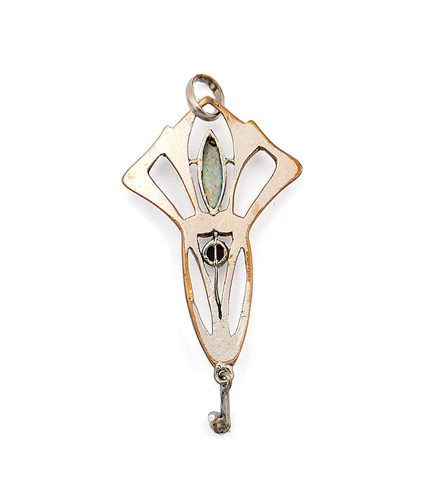 Offen gearbeiteter, vergoldeter Korpus (aus vermutlich Tombak), der aus symmetrisch geschwungenen, in der Form vegetabil wirkenden Stegen gebildet wird, der zwei Schmucksteine in Zargenfassung integriert hat (wohl Opal und Granat), unterseitig kleine Abhängung mit Saatperle. Oberseitig einfache, bewegliche Anhänger-Öse. Maße ca. 4,5 x 2 cm, geringe Tragespuren. Ungemarkt, wohl Deutschland um 1900.