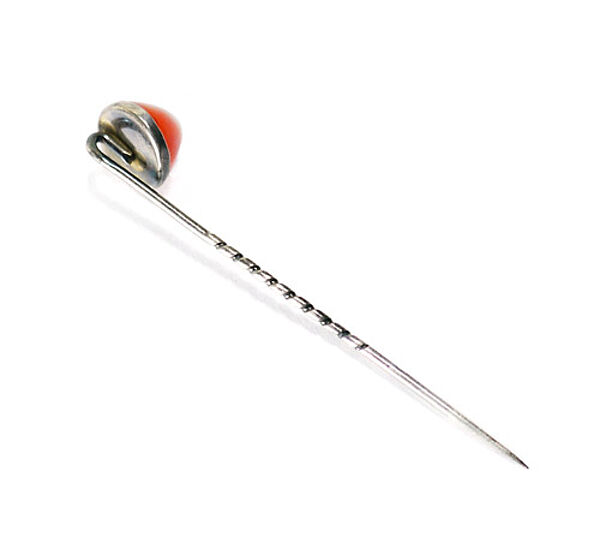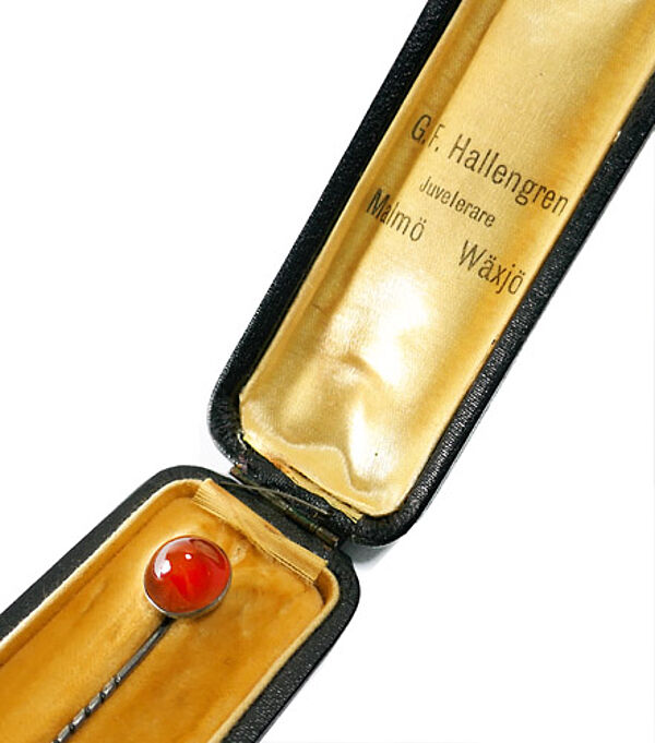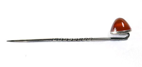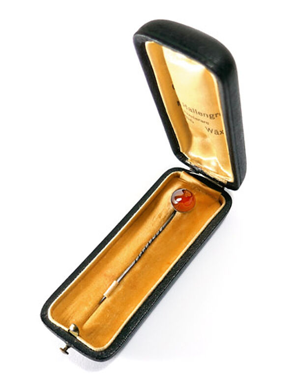 Der silberne Korpus (geprüft) wird durch einen kegelförmigen Schmuckstein-Cabochon (wohl Karneol) in Zargenfassung dominiert, dieser ist rückseitig mit einer schlanken, relativ langen, mittig geriffelten Nadel verbunden. Länge ca. 6 cm, ungeputzter Zustand mit minimaler Patina und diskreten Tragespuren. Das originale, innen mit den Herstellerangaben bedruckte Futeral mit schwarzer Leinenoptik hat die Maße (LBH) von ca. 9,5 x 3,3 x 2,5 cm, geringe Altersspuren. Wohl um 1900.