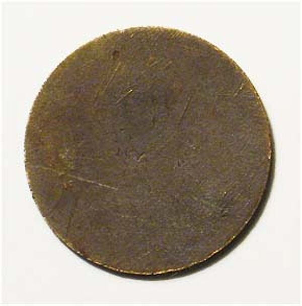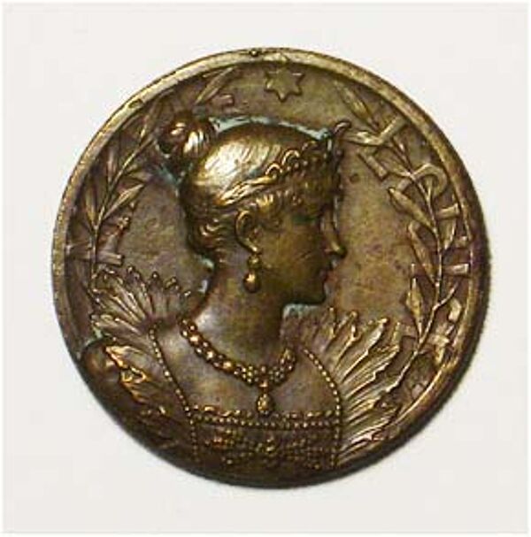 Scheibenförmiger, einseitig gearbeiteter Korpus aus Bronze oder bronze-farbenem Metall (Messing-Legierung?), vorderseitig Frauenbüste im Profil nach rechts, im Randbereich Zweig-Motiv (Lorbeer?) sowie Bezeichnung "Marie Louise" und Künstler-Monogramm, Rückseite ebenflächig, fehlende Öse. Durchmesser ca. 2 cm, warme Patina, geringe Gebrauchs- und deutlichere ältere Putzmittelspuren. Wohl Frankreich um 1900/05.