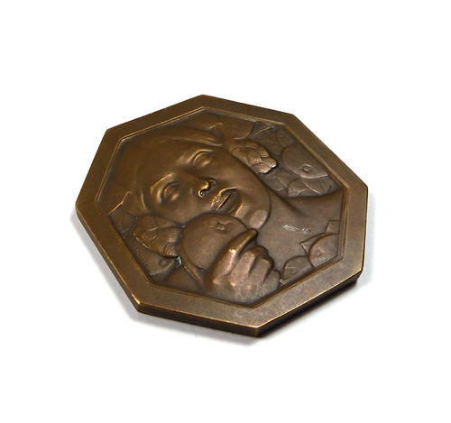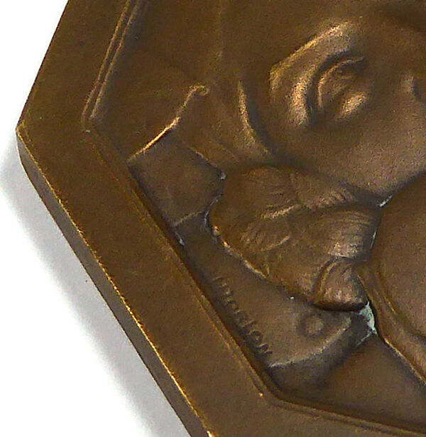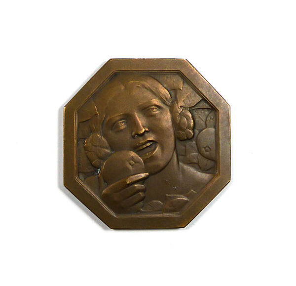 Einseitige, achteckige Bronzemedaille, vorderseitig flach reliefierte Darstellung des Gesichtes eines jungen Mädchens en face, welches gerade in einen Apfel beißen will. Im Randbereich signiert. Durchmesser ca. 5,8 cm, warme, fast gleichmäßige Patina, geringe Altersspuren. Wohl 1910er, 20er Jahre.