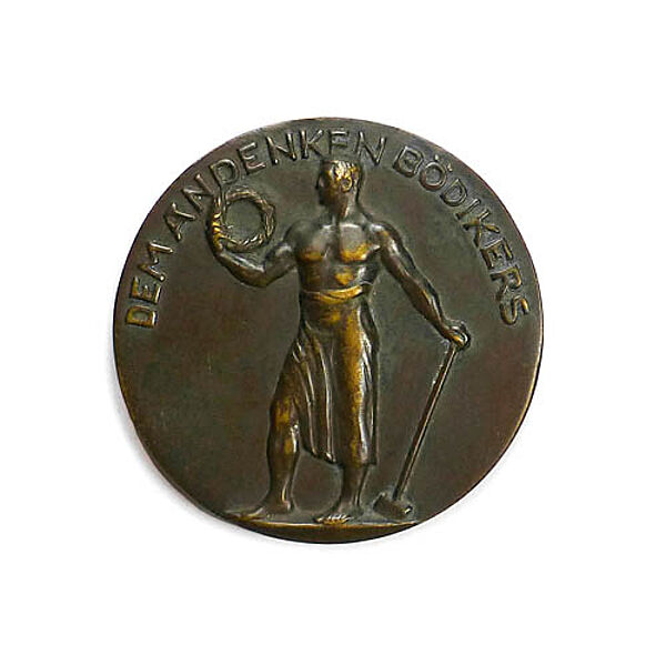 Bronzemedaille ohne Jahr (1910), beidseitig akzentuiert reliefiert, vorderseitig Bödikers Kopf im Profil nach rechts (er war Jurist und erster Präsident des deutschen Reichsversicherungsamtes in Berlin bzw. Generaldirektor bei Siemens & Halske), hier am Halsansatz signiert; rückseitig Arbeiter mit Lendentuch, in einer Hand einen Siegerkranz, in der anderen Hand einen Vorschlaghammer haltend, hier oberseitig umlaufende Bezeichnung "DEM ANDENKEN BÖDIKERS". Durchmesser ca. 7,6 cm, warme braune Patina mit geringen Griff- und Altersspuren. Die Medaille wurde für besondere Verdienste um das Berufsgenossenschaftswesen verliehen.