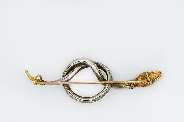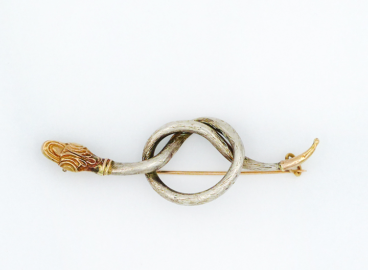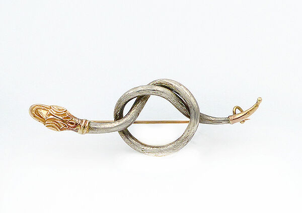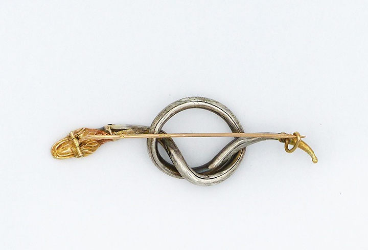 Handgearbeiteter, vollplastischer Silberkorpus (geprüft) einer sich im mittleren Korpusanteil zum Ring verschlingenden Schlange, Schwanzspitze und Kopf sind aus 750er Gold (geprüft). Länge ca. 6 cm. Geringe Tragespuren. Rückseitig einfache, goldene Broschierung. Ungedeutete Bezeichnung, wohl um 1900.