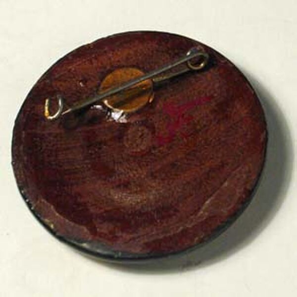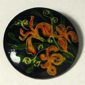 Scheibenförmiger, leicht gewölbter Holzkorpus, vorderseitig polychrome florale (wohl Lilien) Lackmalerei, Durchmesser 4 cm. Rückseitig einfache Nadelung. Geringe Gebrauchsspuren. Wohl Deutschland um 1915.