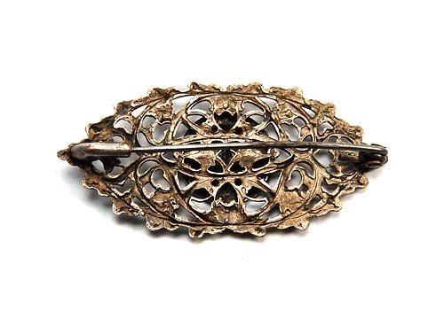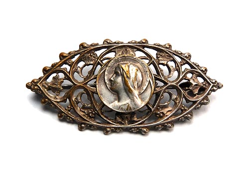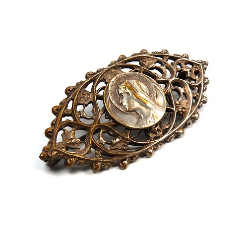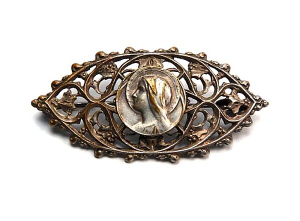 Angedeutet spindelförmiger, offen geabeiteter Korpus aus versilbertem, wohl geprägten Metall, wobei ein Geflecht aus Ranken ein zentrales, kleines Medaillon umschließt, welches den flach reliefierten Kopf einer Heiligen im Profil nach links zeigt. Maße ca. 5 x 2,5 cm, ungeputzter Zustand mit Tragespuren, insbesondere ist die Versilberung deutlicher berieben. Rückseitig einfache Broschierung. Unbezeichnet, wohl Deutschland zwischen ca. 1900 und 1910.