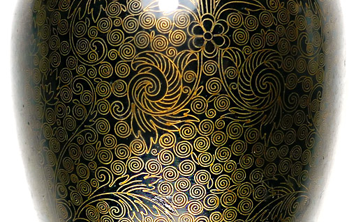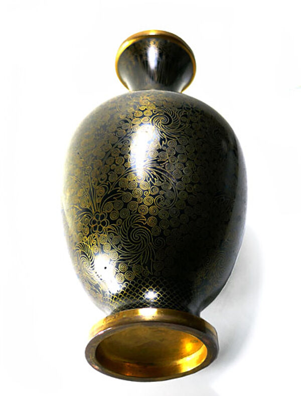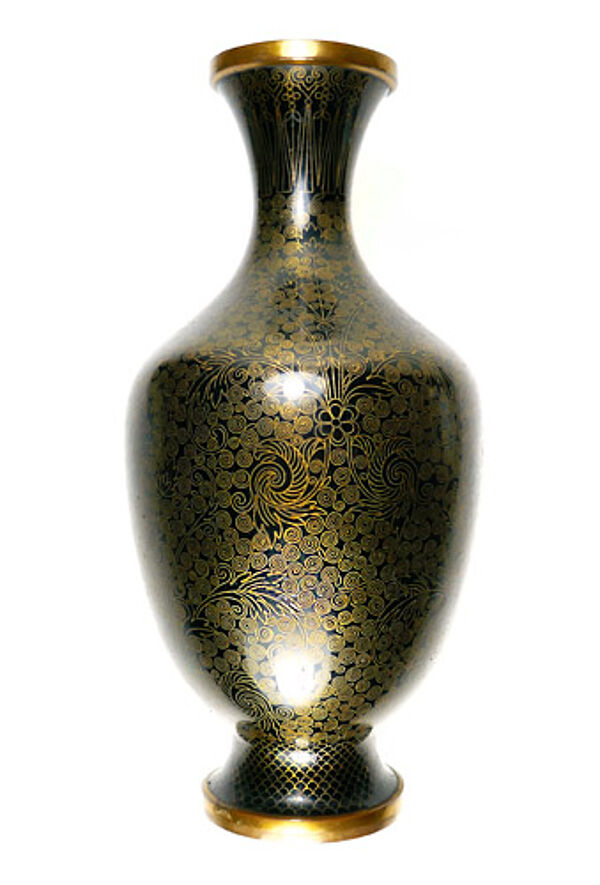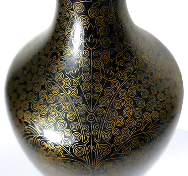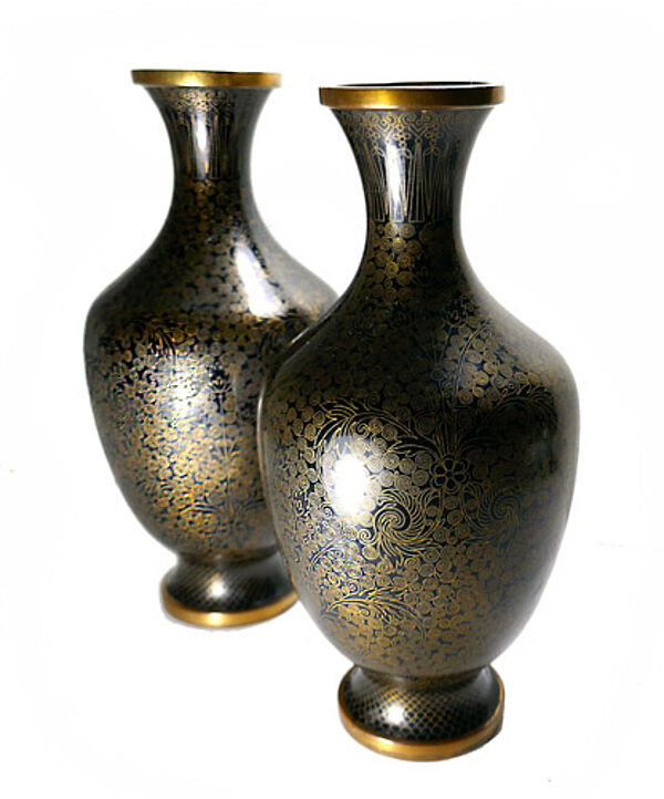 Jeweils gefußter Messingkorpus, dessen eleganter Bauch in einen lang gezogenen, schlanken Hals ausläuft, leicht ausgestellter Mündungsrand. Außenseitig aufwendiges florales Dekor in Cloisonné-Emaille-Technik, monochrom schwarz emailliert. Höhe ca. 19,5 cm, eine der beiden Vasen hat eine kaum wahrnehmbare, kleine Delle an der Schulter, ansonsten zeigen sich nur geringe Altersspuren. Wohl Japan um 1890 bis 1910 (Meije-Periode).