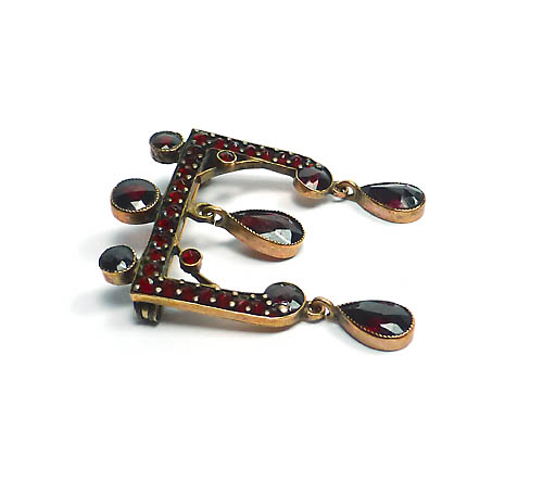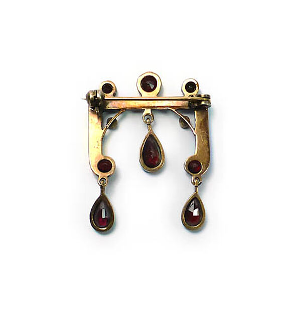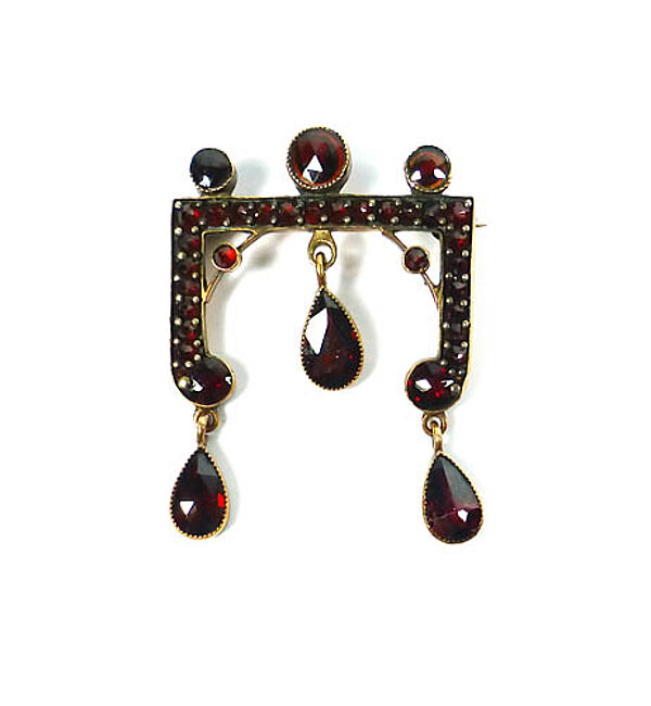 Korpus aus Granat-besetztem Gold-Doublé, wobei die Form an ein stilisiertes architektonisches Element, z.B. an ein Portal erinnert. Oberseitig sind drei kleine, starr fixierte Scheibenelemente und unterseitig drei beweglich abgehängte Granat-Tropfen in Zargenfassung integriert. Länge ca. 3,4 cm, Breite ca. 2,5 cm, geringe Tragespuren. Rückseitig Sicherheitsverschluss mit Kugelkopf. Ungemarkt, wohl Deutschland um 1900.