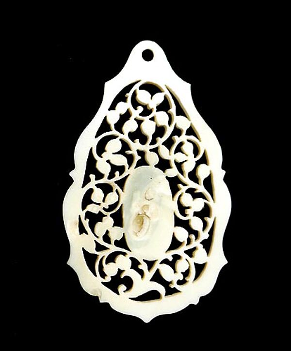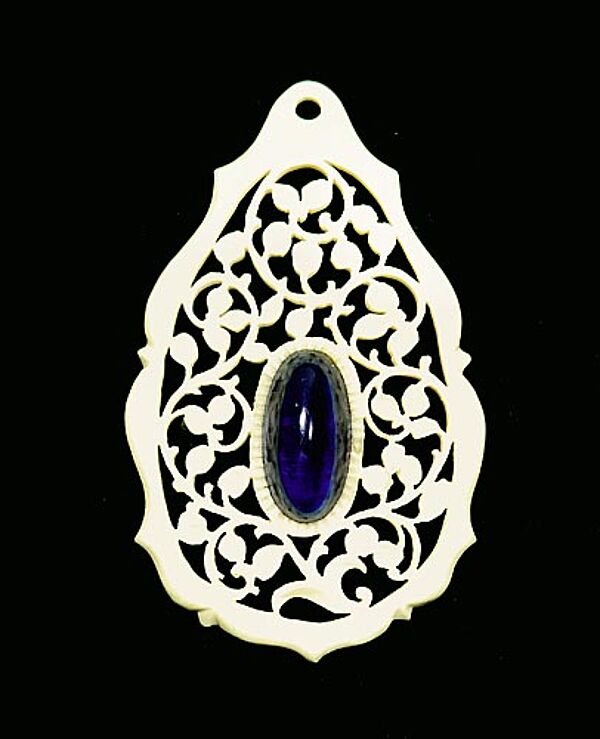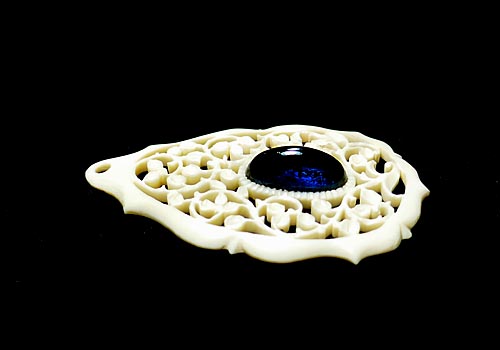 Filigran durchbrochen geschnitzter Elfenbeinanhänger mit stilisiert-floralem Dekor. Mittig befindet sich ein hoch-ovaler, blauer Schmuckstein-Cobochon in Zargenfassung. Am oberen Rand kleines Loch zur Aufhängung. Maße ca. 6,6 x 4 cm, Cabochonmaße ca. 2 x 1 cm, geringe Tragespuren. Wohl Deutschland der 1910er Jahre, evtl. Ferdinand Semmelroth aus Nürnberg, der ebenso wie der berühmtere Emil Kellermann aus Nürnberg, einen Schwerpunkt seines Schmuckschaffens dem Elfenbeinschmuck widmete (angeregt durch die kunstgewerblichen Meisterkurse des Bayerischen Gewerbemuseums Nürnberg, die ab 1901 durch dessen Direktor Theodor von Kramer jährlich durchgeführt wurden und so anerkannte Lehrer gewinnen konnte, wie Paul Haustein, Peter Behrens und Richard Riemerschmid).