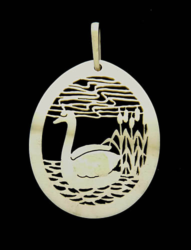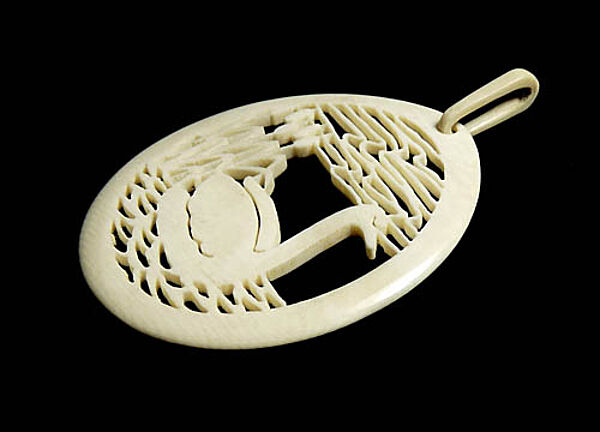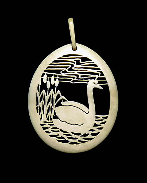 Hochovaler, fein handgesägter, zentral teiweise offen gearbeiteter Elfenbeinkorpus mit leicht stilisierter Darstellung eines schwimmenden Schwanes, im Hintergrund links ist Schilf zu erkennen, im oberen Anteil wellenartige Wolkenbänder. Es wird hier, fast schon ein wenig humorisitisch, die Inkunabel des deutschen Jugendstils, das von Otto Eckmann um 1896/97 für einen Wandteppich entworfene Schwanen-Motiv auf etwas naive Weise modifiziert. Oberseitig einfache, längliche Elfenbeinöse. Maße des Anhängers ca. 5,5 x 4,5 cm, Gesamtlänge mit Öse ca. 6,7 cm. Geringe Tragespuren, insbesondere vorderseitig leichte Patina. Unbezeichnet, wohl Erbach um 1900/05.