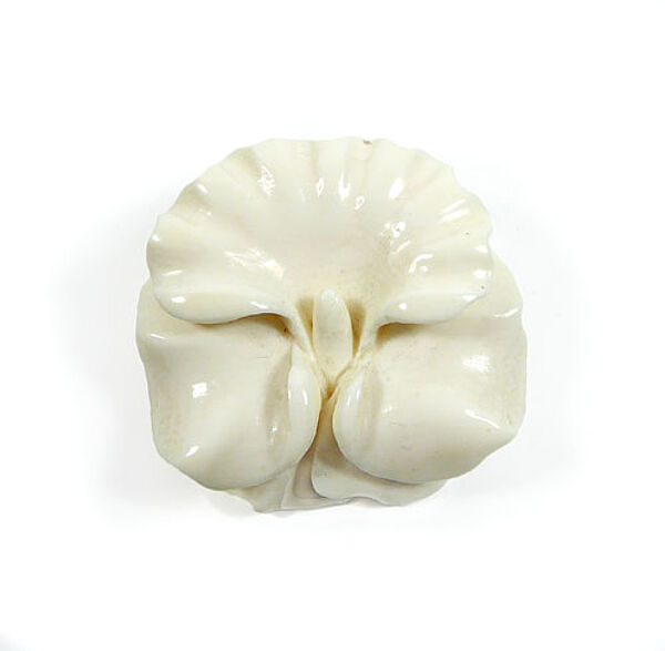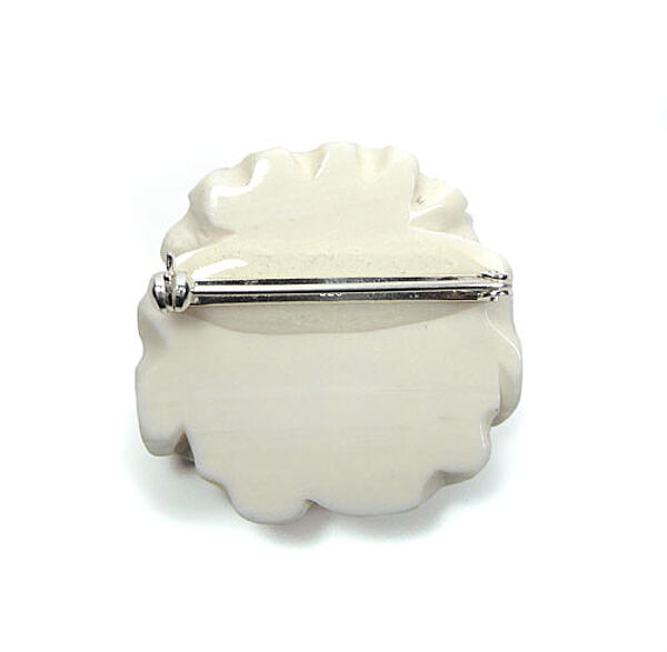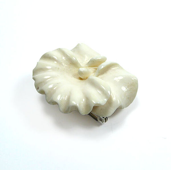 Filigrane, vollplastische Elfenbeinschnitzerei einer Blüte, rückseitig moderne Sicherheitsbroschierung aus Silber Maße ca. 4 x 3,8 cm, geringe Alters- bzw. Tragespuren. Wohl Erlbach der 1910er Jahre.