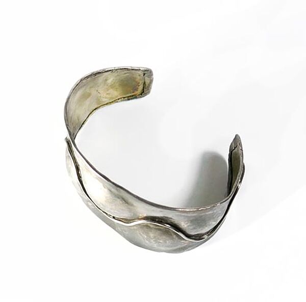Breiter, bandförmiger, sich zu den beiden Enden hin verjüngender und C-förmig gebogener Korpus aus dünnem handgetriebenem Silberblech (geprüft), welches im Randbereich umgeschlagen ist. Oberseitig ist ein wellenartig geformter Steg aufgelötet, zwischen den Wellenbergen weist der Korpus leicht Wölbungen auf. Maße ca. 5,8 x 4,5 cm, größte Breite ca. 3,7 cm, ungeputzter Zustand mit leichter Patina und geringen Tragespuren. Ungemarkt, wohl Deutschland oder Skandinavien der 1910er Jahre.