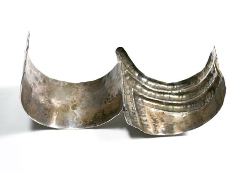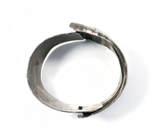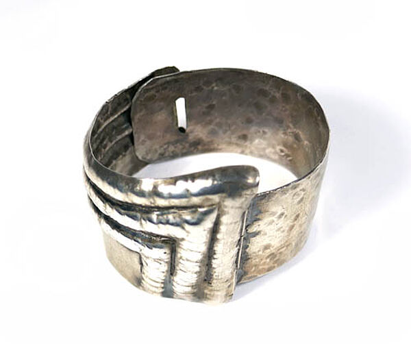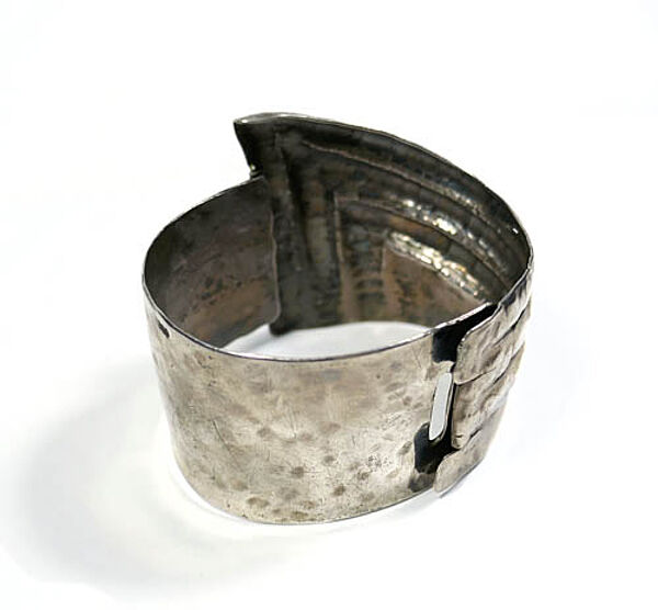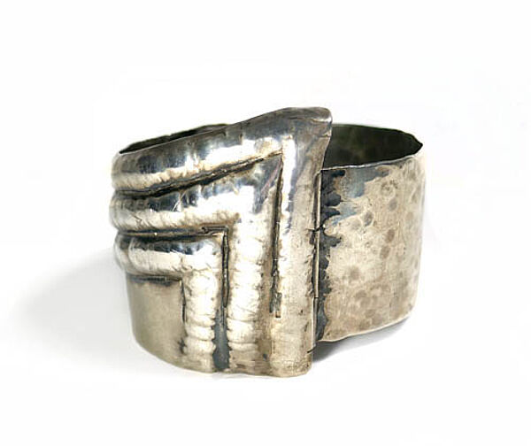 Handgetriebener Silberkorpus (geprüft), der sich aus zwei C-förmig gebogenen, bandförmig-breiten Teilen zusammensetzt, die durch ein Scharnier miteinander verbunden sind. Einfacher Hakenverschluss. Der eine Teil des Armbandes weist lediglich ein moderates Hammerschlagdekor auf, der andere Teil zeigt drei untereinander liegende, bandförmig angeordnete, wulstartige Erhöhungen, die dessen Oberfläche von der Mitte bis zum oberen Rand dominieren und diesem parallel folgen, hier am sich allmählich verbreiterndem Ende einen rechten Winkel bildend. Maße des ovalen Querschnittes im geschlossenen Zustand ca. 5,6 x 4,6 cm, Höhe ca. 4,8 cm. Ungeputzter Zustand mit leichter Patina und geringen Tragespuren. Ungemarkt, wohl Deutschland der 1910er, 20er Jahre.
