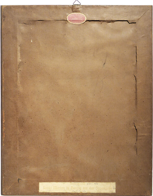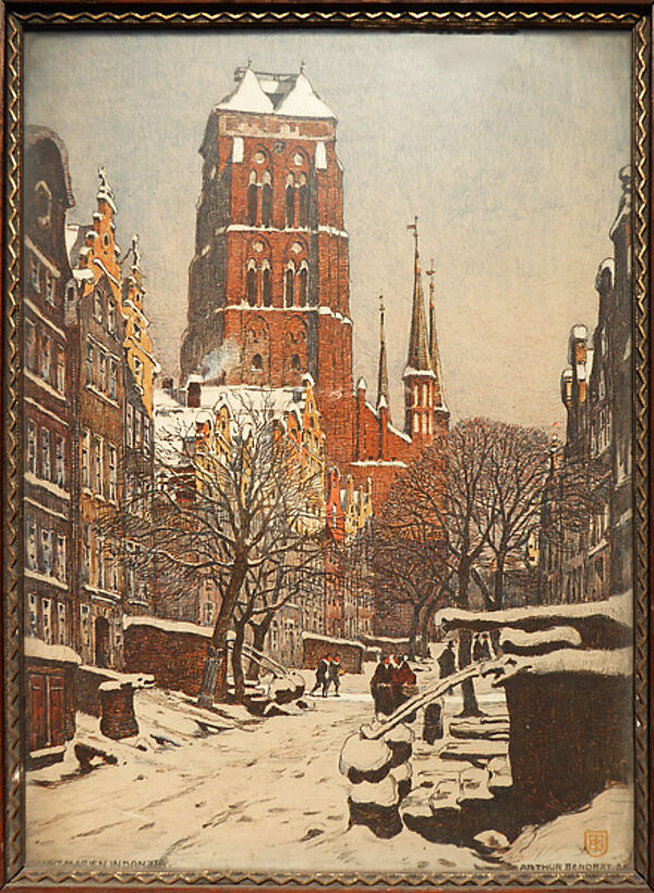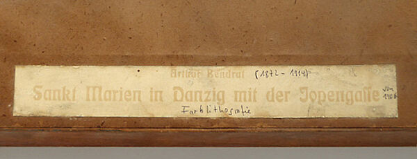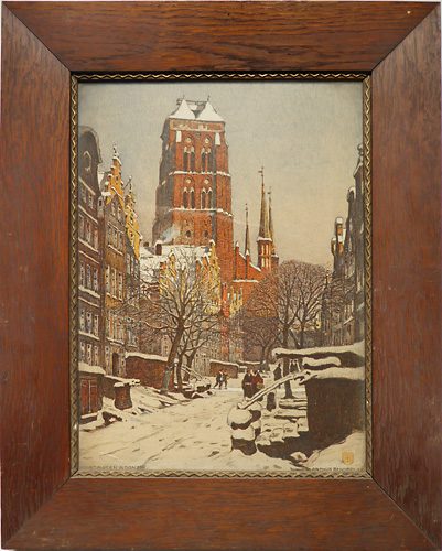 Farblithografie auf Papier, rechts unten im Stein monogrammiert und künstlerbezeichnet, links unten im Stein ortsbezeichnet "Sankt Marien in Danzig", rückseitig typografisch ausführlicher bezeichnet (Aufkleber): "Sankt Marien in Danzig mit der Jopengasse". Sichtbare Bildmaße ca. 40 x 29,5 cm, Außenmaße der originalen, braun gebeizten, breiten, einfachen Eichenleiste mit innenseitig umlaufender, schmaler, vergoldeter Zierleiste ca. 55 x 44 cm.