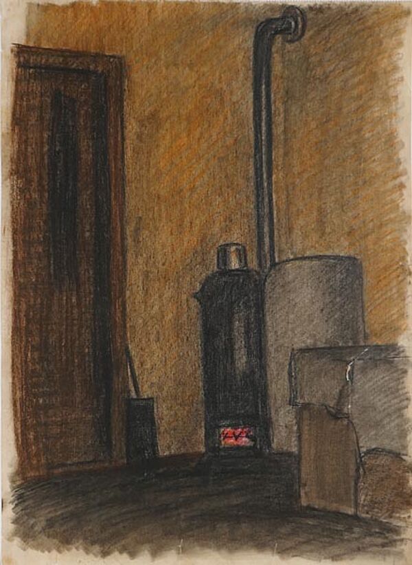 Farbstiftzeichnung: ohne Titel (Interieur mit Ofen)