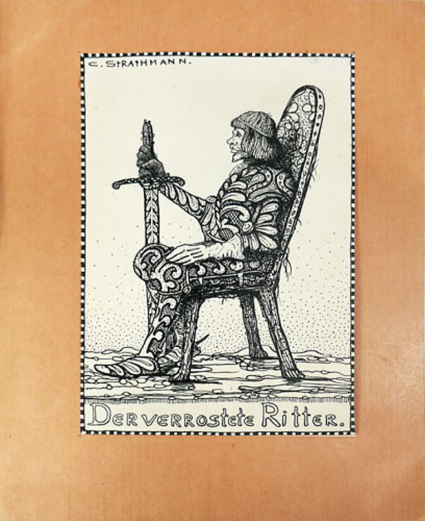 Federzeichnung auf leicht chamoistonigem Papier, links oben signiert. Oberseitig montiert auf dünnem, orange-ocker-farbenen Karton. Bildmaße ca. 18,2 x 12,7 cm, Blattmaße ca. 25 x 20 cm, geringe Alters-, Griff- und Lagerspuren. Wohl um 1895 bis 1910 (der Ritter auf dieser Zeichnung ähnelt in einigen formalen Aspekten dem des Gemäldes "Kampf mit dem Drachen", welches Strathmann im Jahre 1894 schuf, stilistisch ähnelt wiederum eher der Zeichnung "Kniender Orientale am Teich", welche 1911 datiert ist).