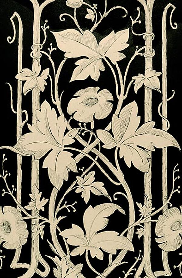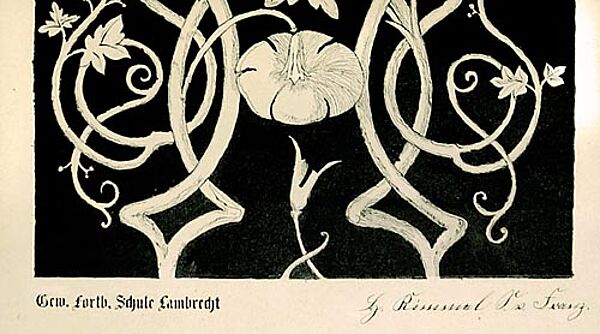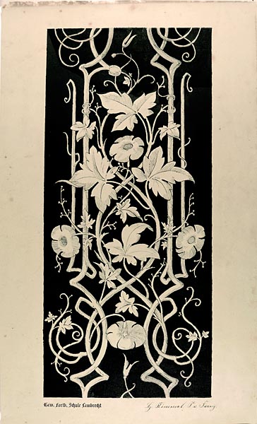Federzeichnung auf kräftigem, chamoisefarbenen Papier. Wohl Studienarbeit des Künstlers, da neben seiner Signatur rechts unten noch eine weitere Unterschrift zu finden ist, hier hat vermutlich ein gewisser "S.v. Franz" das Blatt abgenommen, wahrscheinlich gehörte er zum Lehrkörper der Gewerblichen Fortbildungsschule Lambrecht, so ist das Blatt links unten auch bezeichnet. Blattmaße ca. 50 x 30 cm, Bildmaße ca. 43,5 x 19 cm, geringe Alters- Griff- und Lagerspuren. Wohl um 1890 / 95.