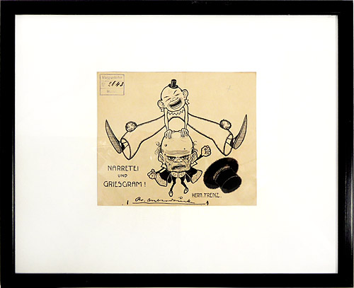 Tusche auf dünnem, chamoistonigem Karton, rechts unten im Bild signiert, links unten betitelt. Am unteren Rand mit der Hand gezogene Begrenzung für den Andruck, links oben Archivstempel der Meggendorfer Blätter. Blattmaße ca. 14,2 x 12 cm, Außenmaße der einfachen, neuzeitlichen, schwarzen Holzleiste ca. 32 x 25,8 cm. Geringe Altersspuren, Blatt minimal gebräunt. Wohl um 1910.