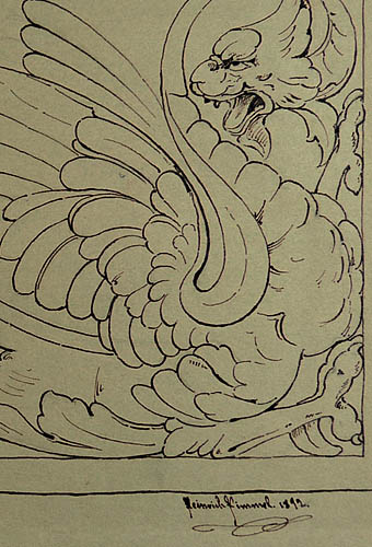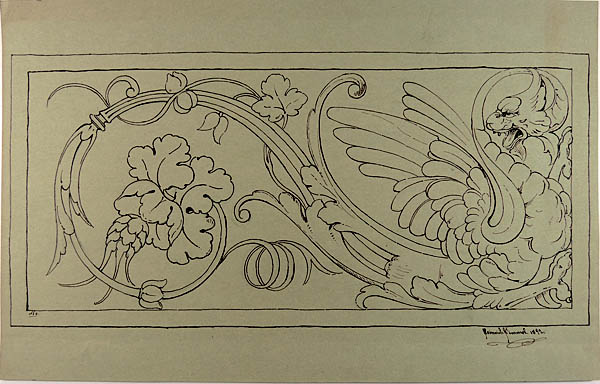 Historistische, schon etwas vom Jugendstil geprägte Federzeichnung eines Fabelwesens auf hell-oliv-tonigem Papier, vermutlich Stuck- oder Musterentwurf. Links unten bezeichnet mit "Nr. 4", rechts unten signiert und datiert "1892". Blattgröße ca. 33 x 21 cm, geringe Alters- und Griffspuren.