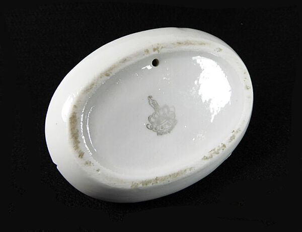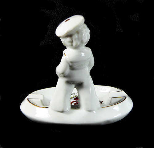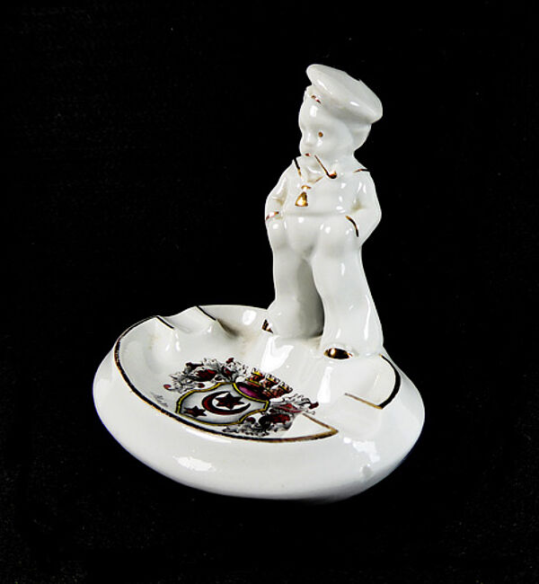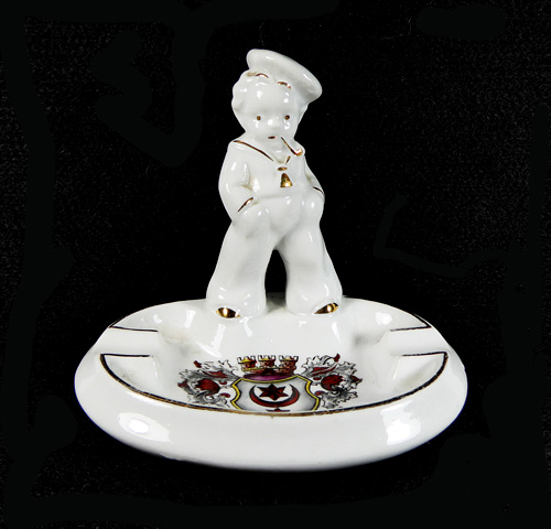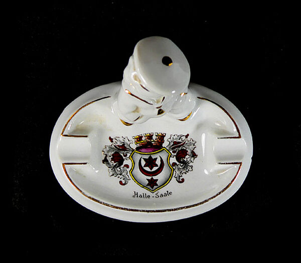 Weißer Porzellankorpus: am Rand einer flach gemuldeten, ovalen Schale steht eine Matrosenfigur, diese mit sparsamer Vergoldung akzentuiert. Im Schalengrund lithografiertes, leicht koloriertes Wappen der Stadt Halle. Breite ca, 11 cm, Höhe ca. 10 cm, geringe Alters- und Gebrauchsspuren. Unterseitig Markung, wohl zwischen 1900 und 1915.