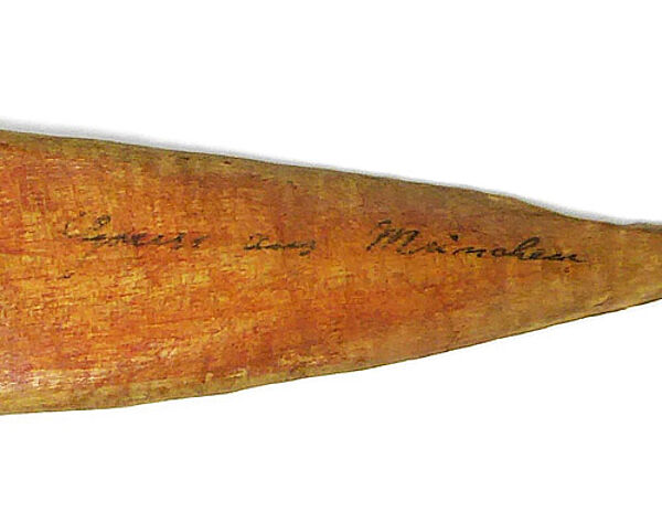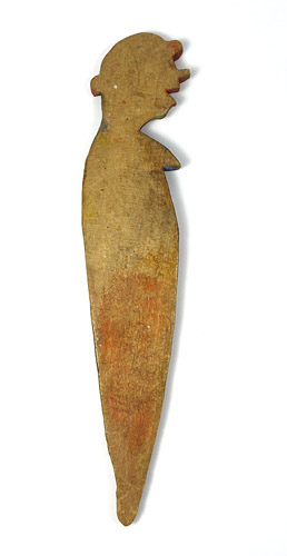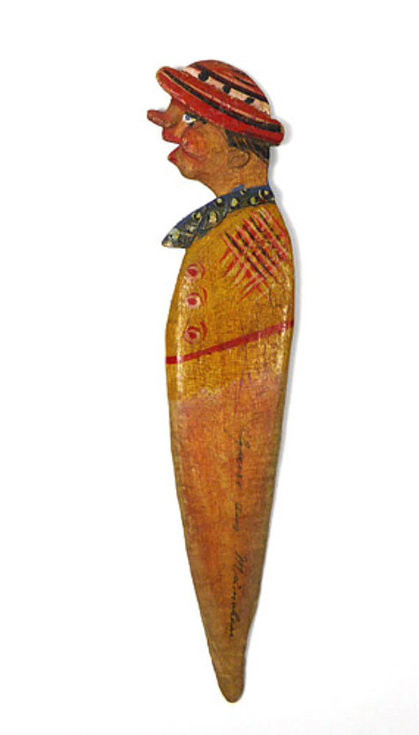Der auf der Rückseite plane und vorderseitig flach-reliefartig handgeschnitzte und zum Teil farbig gefasste Holzkorpus zeigt im Bereich der Handhabe die humorisitisch-naive, stilisierte Brustdarstellung eines bayrischen, tölpelhaft wirkenden Burschens mit rotem Hut und Halstuch im Profil nach links, der untere Teil hat die Form einer Klinge, hier handschriftlich bezeichnet: "Gruss aus München". Länge ca. 17 cm, moderate Gebrauchsspuren, insbesondere zeigen sich Bereibungen. Wohl um 1905 bis 15.