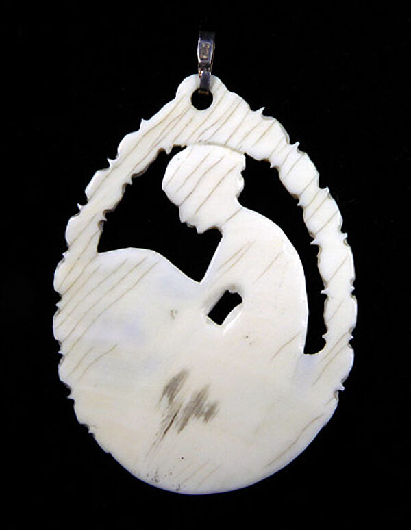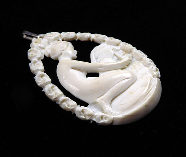 Feine geschnitzter, offen gearbeiteter, annähernd ovaler, nach oben spitz zulaufender Elfenbeinkorpus: flach reliefierte Darstellung eines an einer Quelle wasserschöpfenden, weiblichen Aktes, eingerahmt von einer Rosenblütenranke. Oberseitig einfache, bewegliche Silberöse. Maße ca. 5,8 x 3,8 cm, geringe Tragespuren. Ungemarkt, wohl Erlbach um 1900 bis 1915.