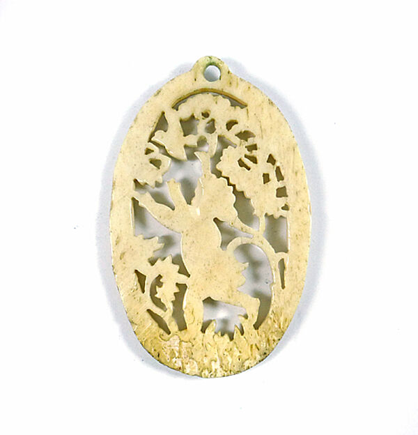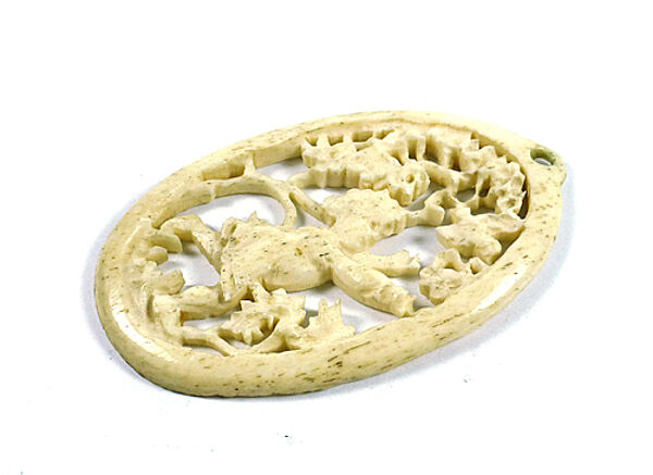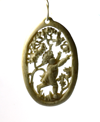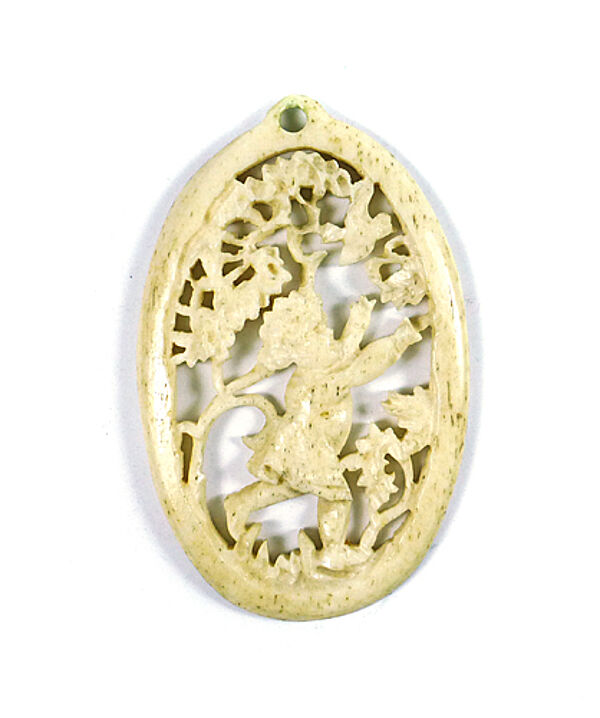 Hochovaler, handgeschnitzter Korpus aus Bein (Knochen): ein Knabe versucht einen Schmetterling zu fangen. Oberseitig gebohrte, kleine Öse. Länge ca. 6,5 cm, Breite ca. 4 cm, geringe Patina mit leichten tragespuren. Wohl Deutschland um 1910 bis 20.