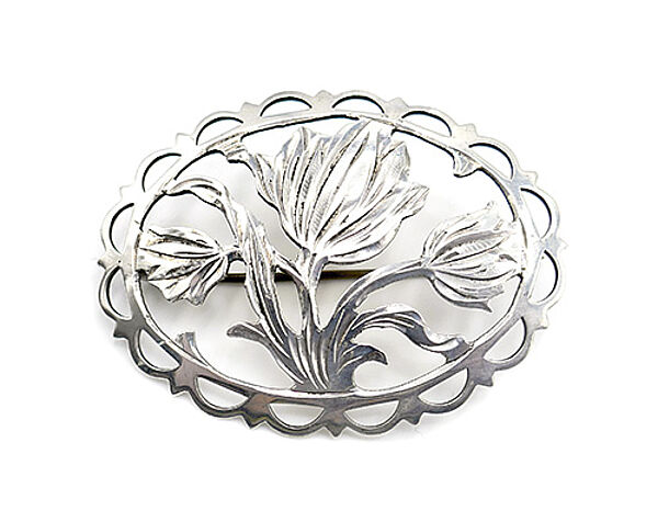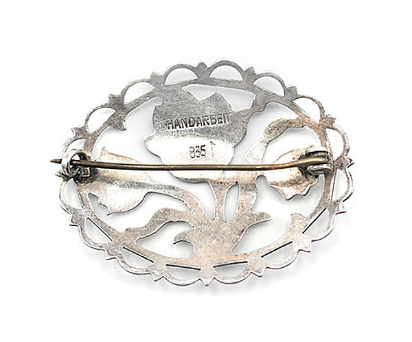 Handgesägter, offen gearbeiteter, querovaler Silberkorps (835er), der mittig eine stilisierte Blumendarstellung (vermutlich drei Tulpen) zeigt. Vorderseitig einfache Punzierungen zur Motivkomplettierung. Maße ca. 4,2 x 3,1 cm, ungeputzter Zustand mit minimaler Patina und geringen Tragespuren. Rückseitig einfache Broschierung sowie Bezeichnung "HANDARBEIT". Ungemarkt, wohl Deutschland der 1910er, 20er Jahre.