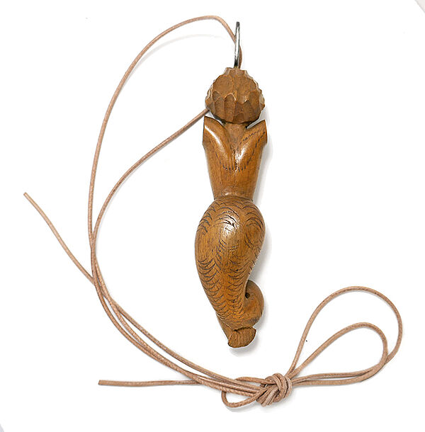 Fein geschnitzter, vollplastischer Holzkorpus (Birne?) in Form einer Nixe (Arme fehlen). Kopfseitig später angebrachte Silberöse (925er), Länge ca. 10,5 cm, mit Öse ca. 12 cm. Geringe Tragespuren, neuzeitliches Lederband. Wohl 1880 bis 1900.