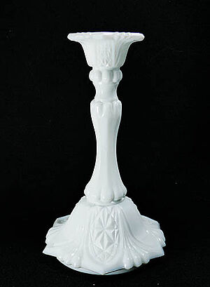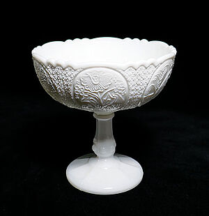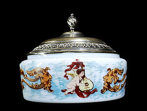 Weiße Glasdose mit Metalldeckel, sagen- bzw. märchenhaftes Dekor