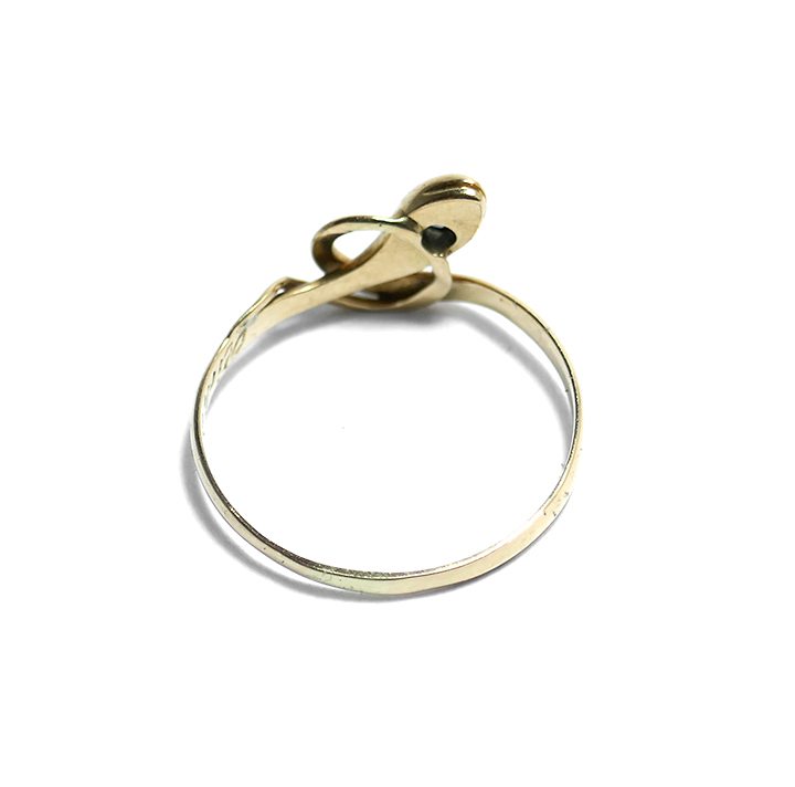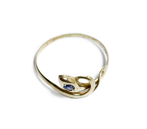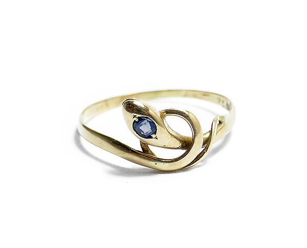 Handgefertigter Goldring (585er) in Form einer sich (um den Finger) windenden Schlange, wobei der Ringkopf durch den Kopf der Schlange gebildet wird, dieser hat hier einen Saphir (= 0,11 Carat) integriert. Ringgröße ca. 54 (= Durchmesser 17,2 mm, Gewicht 1,42 Gramm), Ringkopfdurchmesser ca. 10 mm. Geringe Tragespuren. Innenseitig graviert "Richard". Wohl um 1905 bis 15.