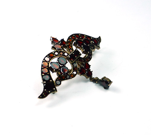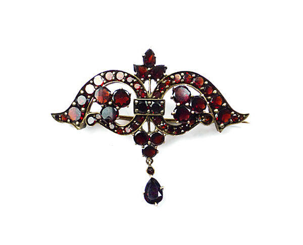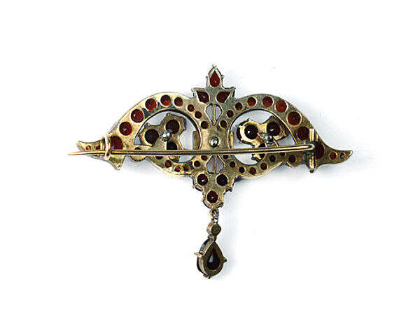 Offen gearbeiteter, mit facettierten Granaten besetzter Korpus aus vergoldetem Tombak, in der Form an einen stilisierten Vogel erinnernd. Breite ca. 5 cm, Länge mit Abhängung ca. 4 cm, geringe Alters- und Tragespuren. Rückseitig einfache Broschierung. Wohl Böhmen um 1900 bis 1915.