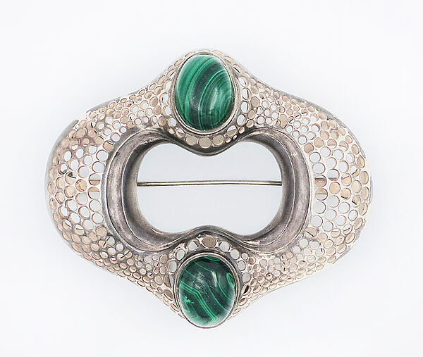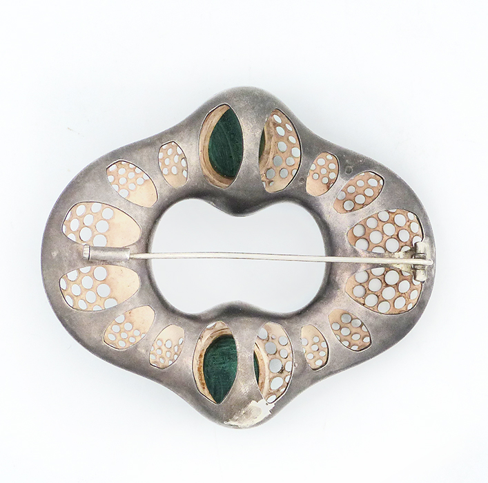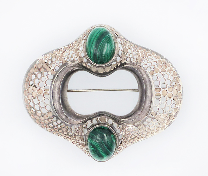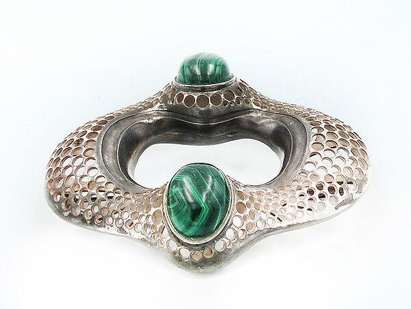 Quer-ovaler, mittig geöffneter, organisch geschwungener Silberkorpus (geprüft), dessen Vorderseite kleinlochig perforiert ist und ober- bzw. unterseitig jeweils einen ovalären Malachit-Cabochon in Zargenfassung integriert hat. Die Rückseite weist eine Reihe größerer, ovalärer Öffnungen auf. Breite ca. 8 cm, Höhe ca. 7 cm, geringe Tragespuren, leichte Patina. Rückseitig Sicherheitsbroschierung mit verschiebbarem, zylindrischen Kopf. Ungemarkt, wohl 1910er Jahre.