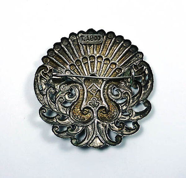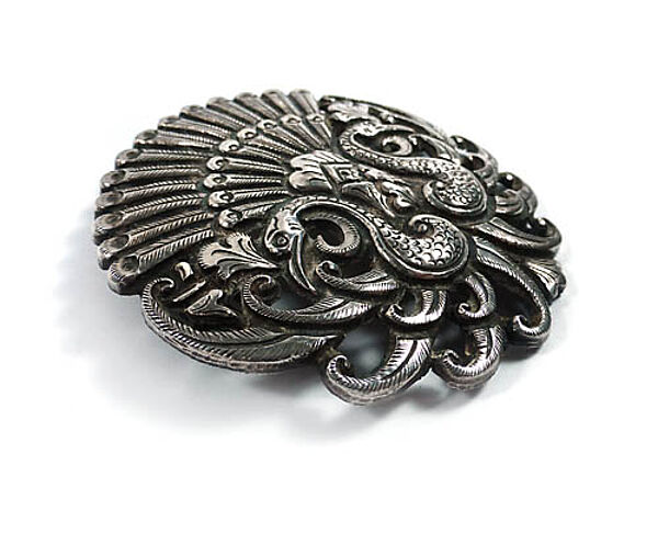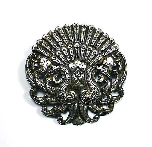 Großer Silberkorpus (800er) mit fein ausgeführtem Flachrelief zweier symmetrisch angeordneter, stilisierter Pfauen. Diese sind mit einem filigran gepunztem Dekor versehen. Durchmesser ca. 6 cm, ungeputzter Zustand mit fast gleichmäßiger Patina und geringen Tragespuren. Rückseitig einfache Broschierung und ungedeutete, etwas schwer lesbare Markung "TvA" oder "TJA", wohl Deutschland um 1885 / 95.