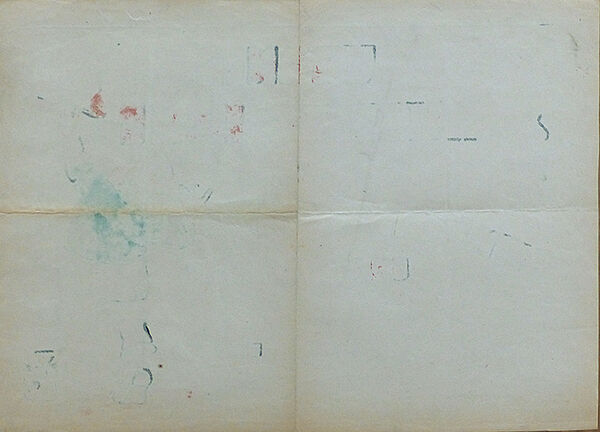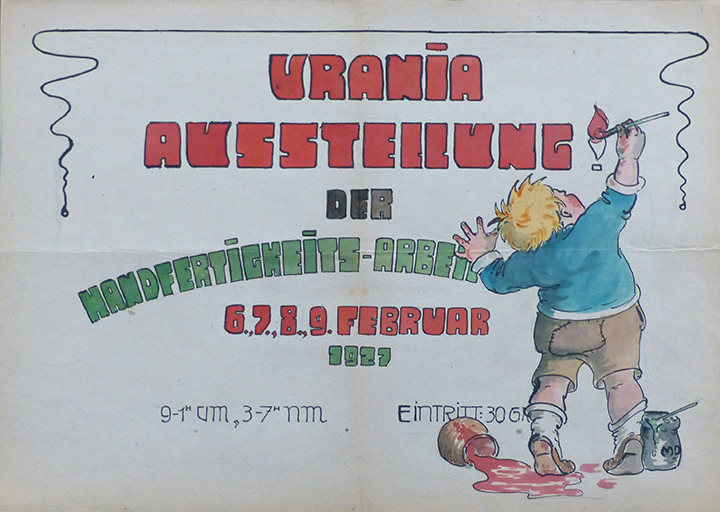 Querrechteckiges, handgemaltes (aquarellierte Federzeichnung) Plakat auf leicht chamoistonigem Papier. Dargestellt ist die Hinteransicht eines den Plakattitel malenden Knaben, der mit dem linken Fuß einen Farbeimer umgeworfen hat. Zudem Bezeichnung: "URANIA-AUSSTELLUNG DER HANDFERTIGKEITS-ARBEIT, 6., 7., 8., 9. Februar 1927, Eintritt 30 Gr.". Maße ca. 45 cm x 62,5 cm, deutlichere Alters-, vorallem Knickspuren einer zweimaligen Faltung.