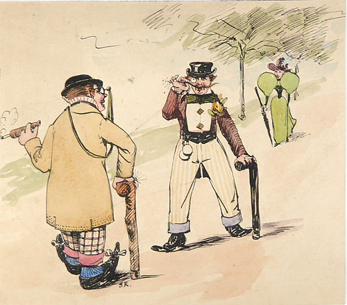 Humoristische aquarellierte Federzeichnung: ohne Titel (Begegnung auf der Promenade)