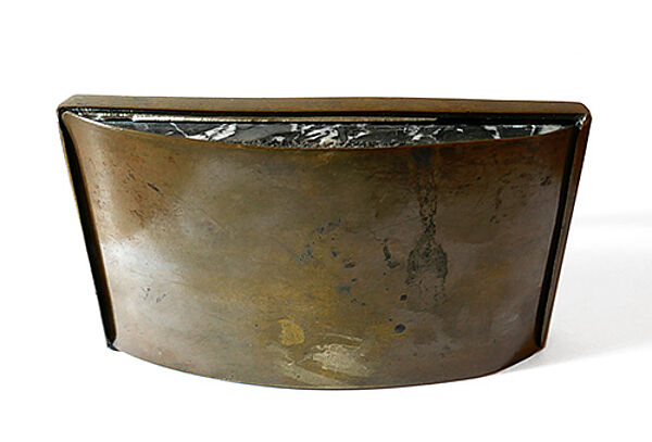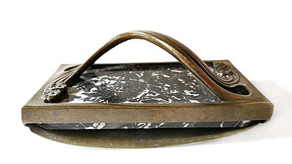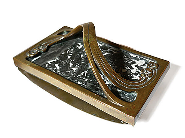 Rechteckiger, rahmenartiger Bronzekorpus, der eine schwarze Marmorplatte mit weißen Sprenkelungen umfasst. Oberseitig wellenförmig geschwungene Handhabe, die an beiden Seiten je zwei plastisch ausgearbeitete Blüten integriert. Unterseitig C-förmig gebogenes Blech, welches das Löschpapier unterlegt. Maße ca. 14 x 8 cm, Höhe ca. 6 cm. Ungeputzter Zustand mit fast gleichmäßiger Patina und geringen Altersspuren. Ungemarkt, wohl um 1900 bis 1905.