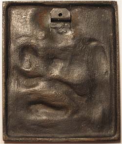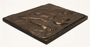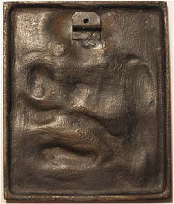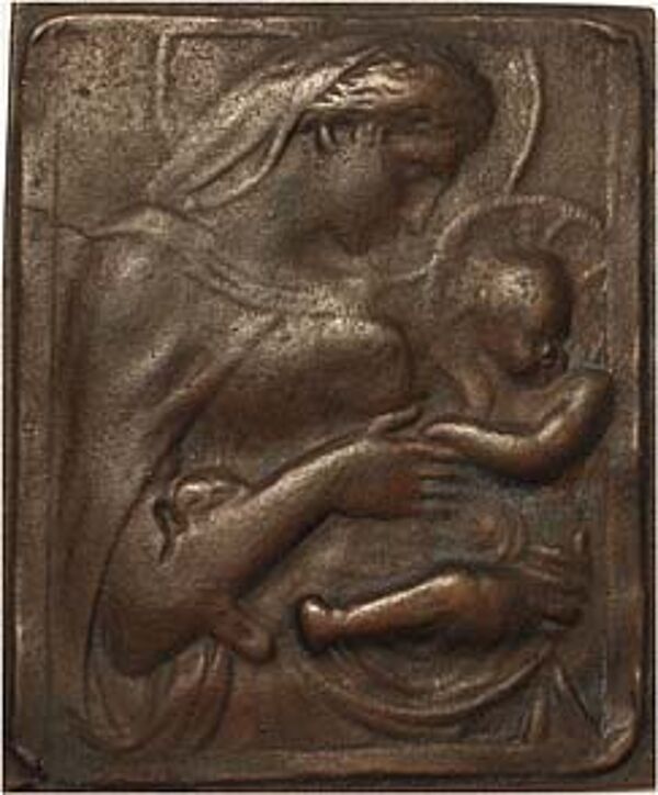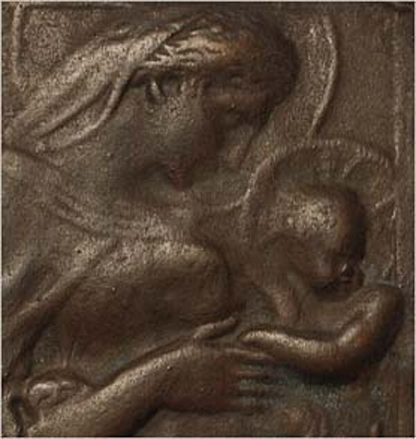 Rechteckiger Korpus aus Bronze mit gleichmäßiger, dunkler Patina und geringen Gebrauchsspuren. Vorderseitig flach reliefierte, sensible Darstellung von Maria mit dem Jesuskind. Größe ca. 11 x 9 cm. Rückseitig einfache Öse zur Aufhängung. Wohl um 1915/20.