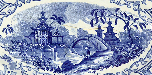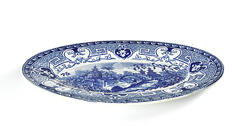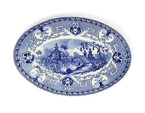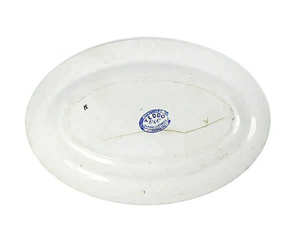 Ovaler, schalenförmiger Keramikkorpus aus hellem Scherben. Oberseitig ist in differnzierten Blautönen eine japanische Flusslandschaft mit einem Fischer dargestellt, im Hintergrund kann man verschiedene Tempel erkennen. Maße ca. 19,5 x 13 cm, Höhe ca. 1,6 cm, durchgehender Haarriss über die Bildmitte, ansonsten nur geringe Altersspuren. Unterseitig Markung, wohl um 1890 - 10.