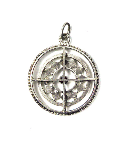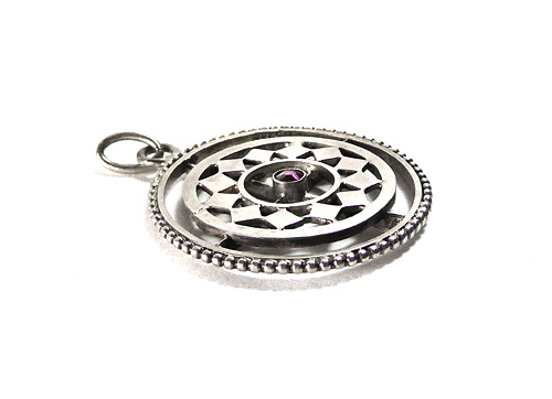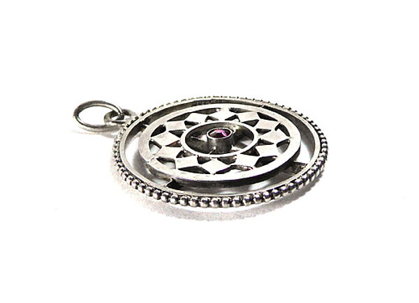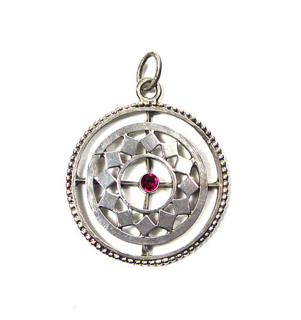 Offen gearbeiteter, feiner Silberkorpus (800er), der sich aus mehreren, unterschiedlich großen, teilweise verzierten Ringelementen zusammensetzt (so außen ein Perlrand), die auf zwei rückseitigen, kreuzförmig angeordneten Stegen fixiert sind. Mittig befindet sich ein faszettierter, roter Schmuckstein in Zargenfassung. Oberseitig starre Anhängeröse mit beweglichem Ring. Durchmesser ca. 2,7 cm, Länge mit Öse ca. 3,5 cm, ungeputzter Zustand mit diskreter Patina und leichten Tragespuren. Ungemarkt, wohl Deutschland der 1910er Jahre.