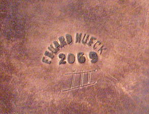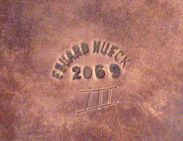 Gebauchter Korpus aus getriebenem Kupferblech mit weitlumigem Gießer. Die dominante, nach oben spitz zulaufende Messing-Handhabe hat einen kräftigen Kunststoff-Griff, der gewölbte Deckel eine angedeutet C-förmige Messing-Handhabe (diese beweglich). Höhe ca. 26 cm. Die Korpus- und Deckeloberfläche weist ein grob gepunztes, kerbenartiges Dekor auf. Diskrete, warme Patina, einige Gebrauchsspuren, insbesondere Oberflächen-Unregelmäßigkeiten an der Bassis vom Gießer. Unterseitig gemarkt "Eduard Mueck" sowie bezeichnet mit Dekor- oder Modellnr. "2069", zudem handgeritzte römisch "III". Der etwas expressive Charakter der Kanne läßt vermuten, daß sie in Holland um 1910 bis 20 hergestellt sein könnte.