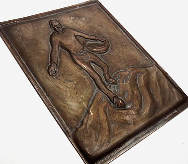 Hochrechteckige, relativ dünne Kupferplatte mit handgetriebener, flachrelieferter Darstellung eines Sämann. Links unten bezeichnet "EGGER-LIENZ" (Motiv), rechts unten "WALTER KRAUS" (handwerkliche Umsetzung). Maße ca. 18,6 x 16,4 cm, fast gleichmäßige, relativ dunkle Patina, mit moderaten Alters- und geringgradigen Kratz- bzw. Griffspuren. Rückseitig deutlichere Oxidation. Nach 1912 (in diesem Jahr entstand das monumentale Triptychon „Erde“, welches auch das Motiv dieses Sämannes beinhaltet).