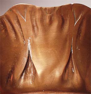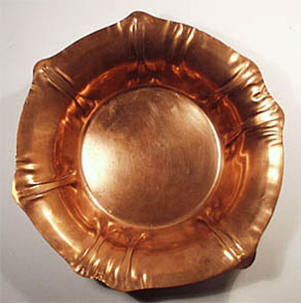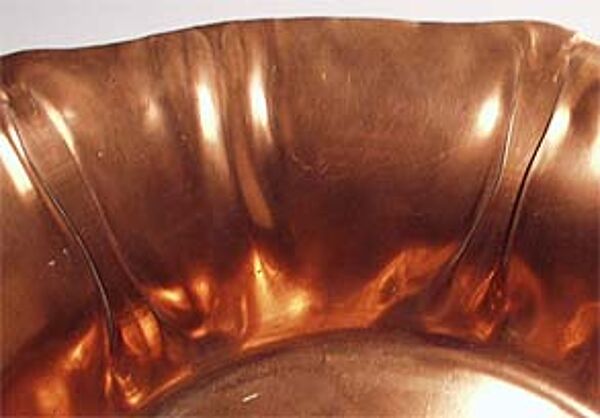 Korpus der Schüssel aus handgetriebenem Kupferblech, klassische Form mit großzügig gewölbtem Rand und planem Boden. In der Wandung sind mehrere, bzgl. des Abstandes eher asymmetrisch angeordnete bandförmige Erhöhungen, die jeweils in einer kleinen Spitze münden, D. ca. 30cm. Ungemarkt, um 1900.