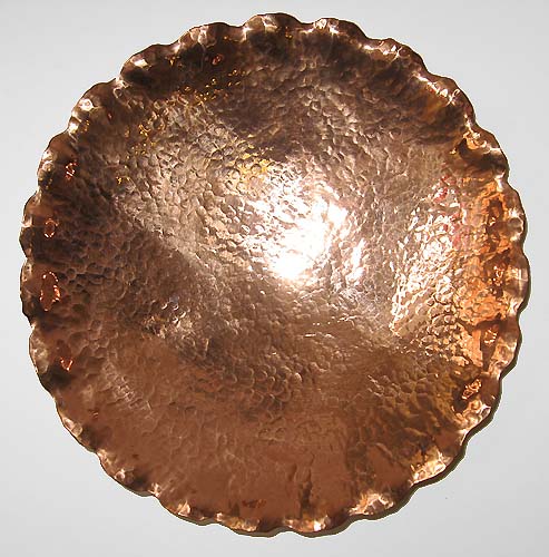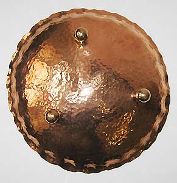 Der schalenförmige Korpus aus getriebenem Kupfer mit relativ expressivem Hammerschlag ruht auf drei Kugelfüßen und hat einen gewellten Rand. Durchmesser ca. 28,5 cm, Höhe ca. 7 cm. Geputzter Zustand mit geringen Gebrauchsspuren. Unbezeichnet, wohl Deutschland um 1915.