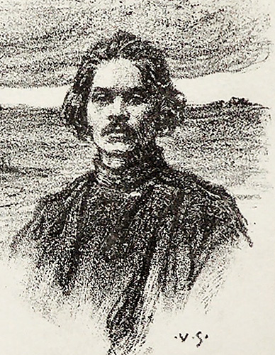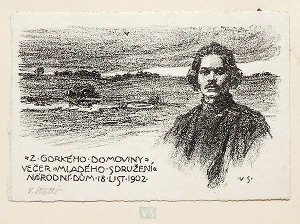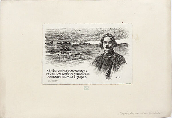Lithografie auf Bütten, rechts unten im Stein monogrammiert, links unten mit Bleistift handsigniert. Zudem bezeichnet: Z GORKEHO DOMOVINY-VECER "MLADEHO SDRUZENI" NARODNI DUM 18. UST 1902". An der rückseitigen Oberkante auf einem dünnen, chamoistonigen Karton fixiert, der im unteren Bereich nochmals das Künstlermonogramm trägt. Bildmaße ca. 17,1 x 11,5 cm, Kartonmaße ca. 32,8 x 22,5 cm, geringe Griff-, Lager- und Altersspuren.