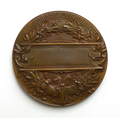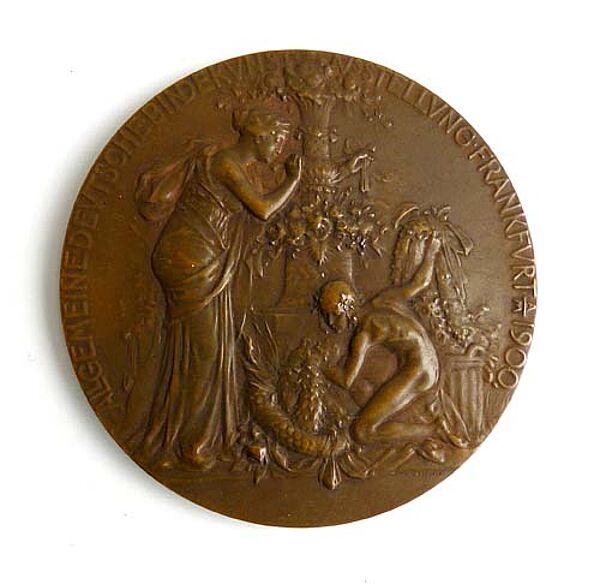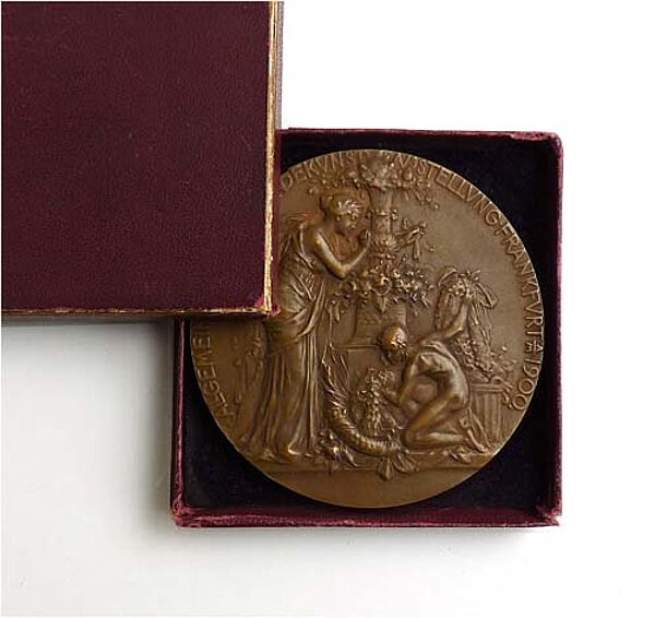 Bronzemedaille, vorderseitig sind zwei Frauen dargestellt, die eine Stele oder Säule bekränzen bzw. mit Blumen schmücken, umseitig bezeichnet: "ALLGEMEINE DEUTSCHE BINDEKUNST-AUSSTELLUNG FRANKFURT A/M 1900". Rückseitig Blumenkranz und leeres Schriftband, oberseitig im Rand bezeichnet: "FÜR VERDIENSTVOLLE LEISTUNGEN". Durchmesser ca. 7,3 cm, ungeputzter Zustand mit warmer, fast gleichmäßiger Patina und geringen Griffspuren. Originaler weinroter Stülpkarton mit deutlicheren Gebrauchsspuren, siehe Foto.