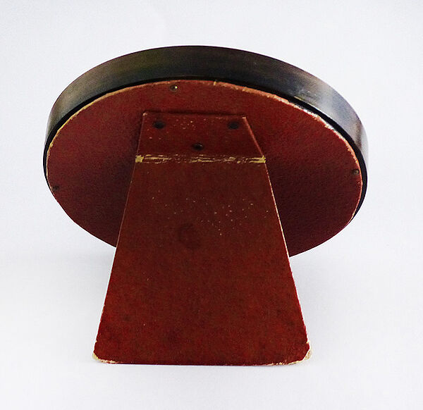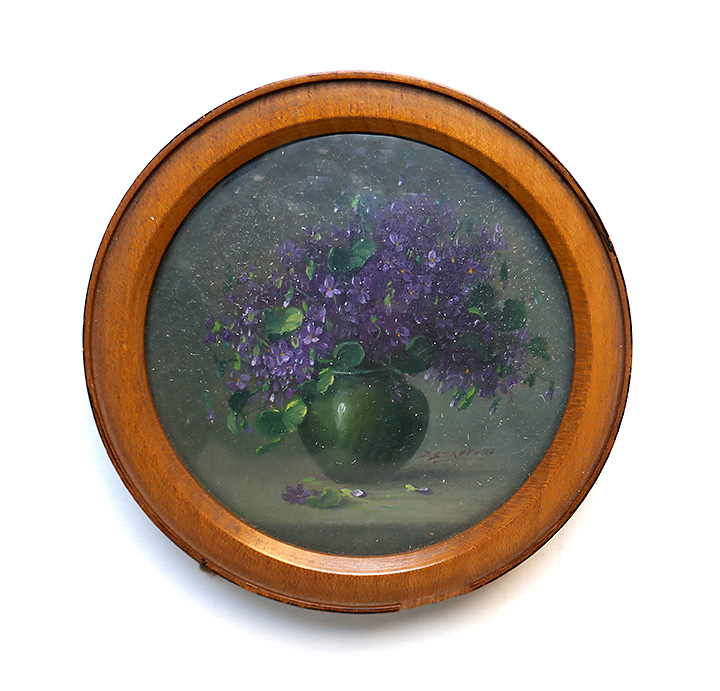 Lupenmalerei hinter Glas auf runder Platte (Bild ungeöffnet), rechts unten signiert. Rückseitig klappbarer Fuß aus weinrot kaschiertem Karton zum Hinstellen des kleinen Bildes. Sichtmaß bzw. Innendurchmesser ca. 6,5 cm, Außendurchmesser der runden, leicht reliefierten, gelbbraunen Holzleiste ca. 8 cm, geringe Altersspuren, so zeigt sich eine kleine Fehlstelle am äußeren Rand des Holzrahmens, siehe Foto. Wohl um 1900 bis 1920.