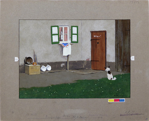Gouache und Aquarell auf grauem, dünnem Karton, rechts unten signiert, rückseitig Archivstempel der Fliegenden Blätter München, hier nummeriert: "5395" und von fremder Hand (?) bezeichnet "E. Kirchner". Auf den Rändern Bemerkungen und Markierungen für den Druck. Blattmaße ca. 39,5 x 31,7 cm, Bildmaße ca. 29,5 x 20,4 cm, geringe Alters- und Staubspuren. Wohl um 1900.