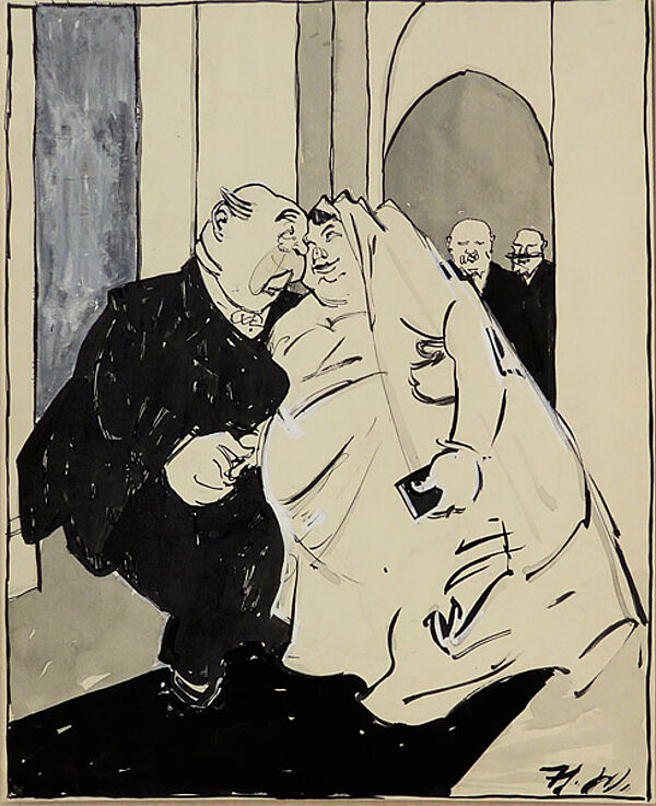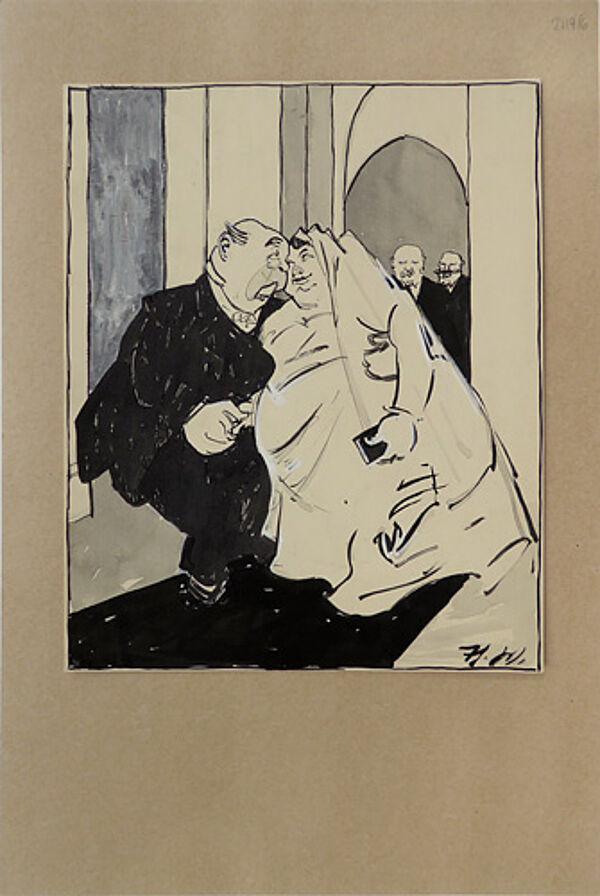 Mischtechnik (Weiß-gehöhte Tuschezeichnung) auf dünnem Karton, rechts unten monogrammiert. Auf Unterlage montiert. Blattmaße ca. 31,2 x 25,2 cm, geringe Alters-, Griff- und Lagerspuren. Wohl um 1910 bis 15, evtl. Illustrationsvorlage für die Zeitschrift "Jugend" für die Waidenschlager tätig war.