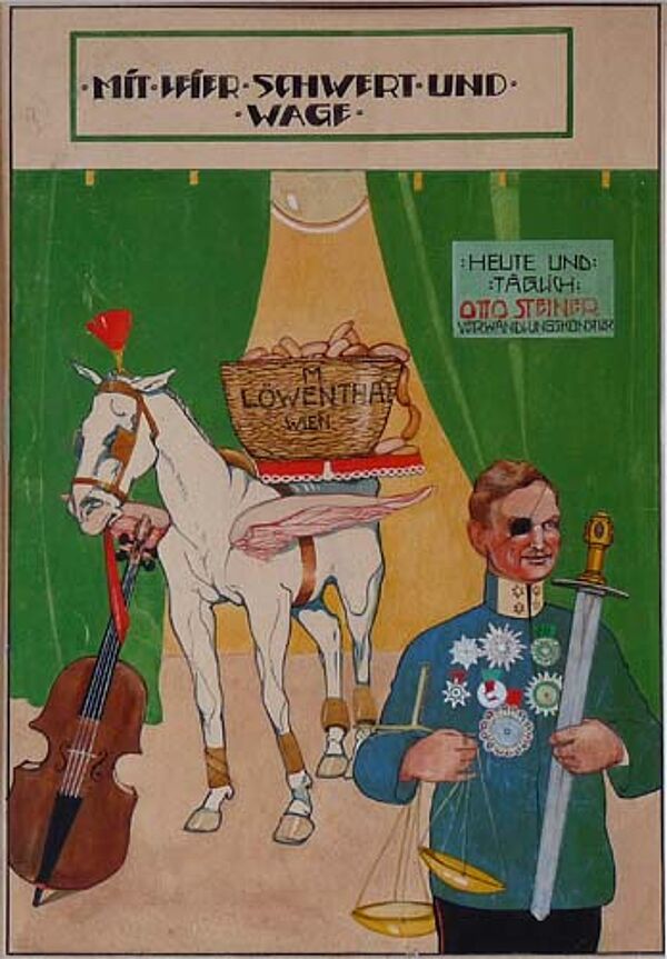 Plakatentwurf in Mischtechnik (Tempera), bezeichnet: "Mit Leier, Schwert und Wage" sowie "M. Löwenthal Wien", zudem "Heute und täglich: OTTO STEINER Verwandlungskünstler". Bildmaße ca. 47 x 33 cm, Blattmaße ca. 51 x 36 cm; moderate Griff- und Verschmutzungsspuren, ein hinterklebter Einriß von ca. 2 cm am Unterrand, ein winziger hinterklebter Einriß (ca. 2 mm) am rechten Seitenrand. Wohl um 1910.