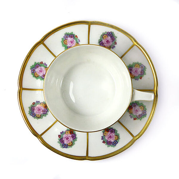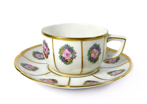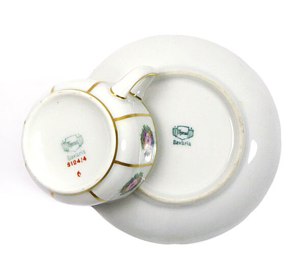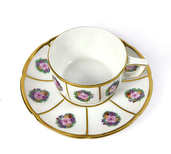 Korpus von Tasse und Untertasse aus weißem Scherben. Das Dekor wird durch eine Reihe von Blumenbuketts gebildet, die in - durch zarte Goldlinien getrennten - Feldern angeordent sind. Höhe 4,7 cm, Untertassendurchmesser ca. 12 cm, geringe Gebrauchsspuren. Unterseitig Markung, wohl 1910er Jahre.
