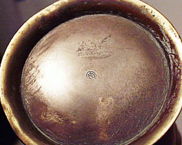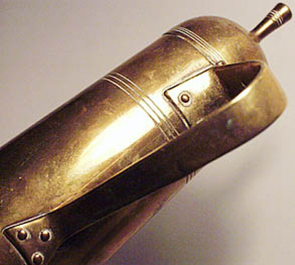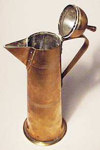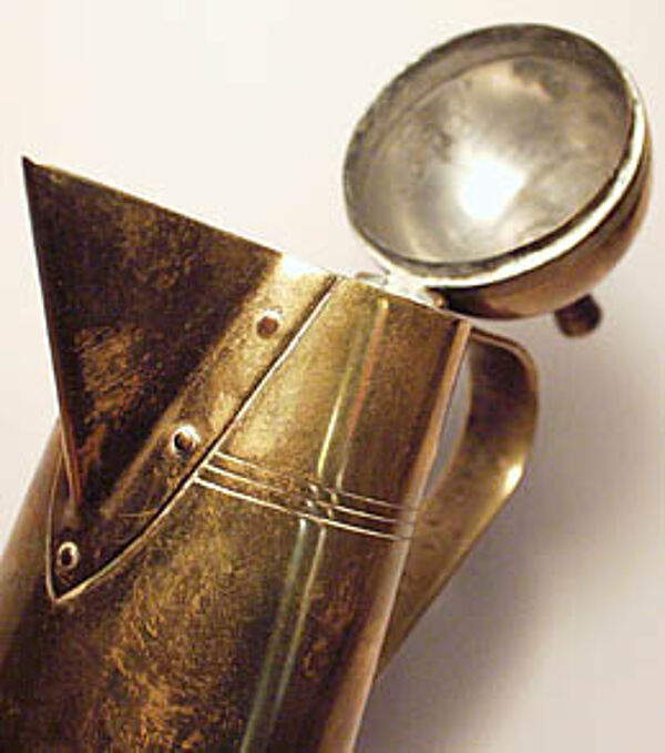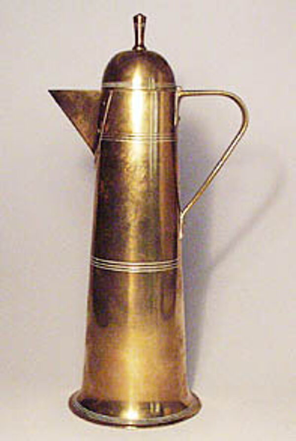 Angedeutet zylindrischer, sich konisch nach oben leicht verjüngender Messing-Korpus; halbkugelförmiger, scharnierter Deckel mit länglichem, fast stabförmigen Griff. Schnaupe und Handhabe sind an den Korpus genietet. Ein einfaches Rillendekor gliedert die Kanne. Höhe ca. 25 cm, Durchmesser Fuß ca. 9 cm. Unterseitig gemarkt. Messing-typische Patina, diskrete Putzmittelreste, geringe Griff- und Gebrauchsspuren; Rohrumwickelung an der Handhabe fehlt.